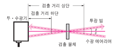 한정반사형 센서는 아래 그림의 광학계와 같이 투광축과 수광축이 검출물체의 표면에서 동일한 기울기각 θ으로 교차하도록 설계되어 있습니다.