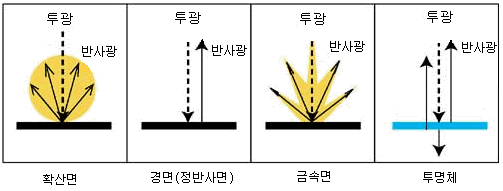 투명체: 거의 정반사면과 같은 모양으로 반응한다. 확산반사는 존재하지만, 매우 작다.