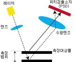 ■ 측정대상물의 거리가 변화하면, 수광소자상의 수광위치가 변화하는 것을 이용하여 변위량을 구합니다.