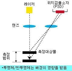 레이저광을 투광렌즈에 의해 집광하여 측정대상물에게 조사합니다. 특정대상물로부터의 반사광은 수광렌즈에 의해서 PSD 상에 결상됩니다. 측정대상물의 거리가 다르면, PSD 상의 경상위치가 달라져 이에 따라 PSD의 두개의 출력이 변화합니다.