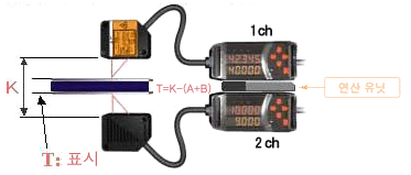 연산 유니트를 앰프 간에 끼우는 것만으로 센서 2대의 연산 결과가 한쪽 앰프에 표시됩니다.