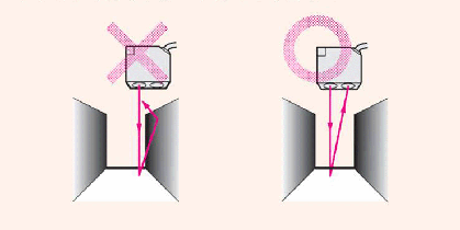 아래 그림과 같이 투광축, 수광축이 내벽에 차단되지 않도록 설치하여 주십시오.