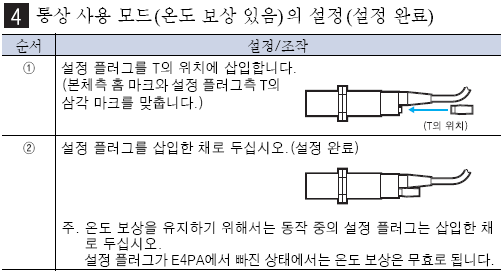설정 플러그가 5분 이상 삽입되지 않으면 온도 보상이 없는 상태(설정 이전의 상태)로