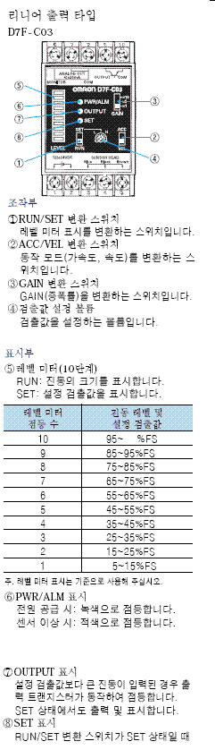 진동센서 D7F-C03은 리니어 출력타입의 컨트롤러 입니다. 하기의 순서로 설정해주세요.