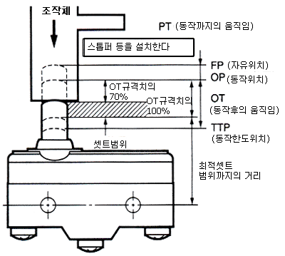 상시개로(NO)을 사용하시는 경우에는, 동작후의 움직임(OT)의 규격치의 70~100%를 기준으로 밀어넣어주세요.