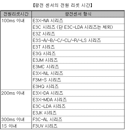 주요 광전센서의 전원 리셋 시간은 아래와 같습니다.
