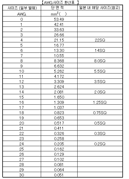 아래와 같이 AWG 와 도체단면적의 관계를 나타냅니다.