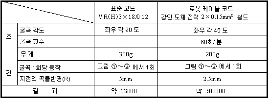내굴곡 횟수는 표준 코드에서는 약 1.3만회, 로봇 코드에서는 약 50만회 정도 실시합니다.