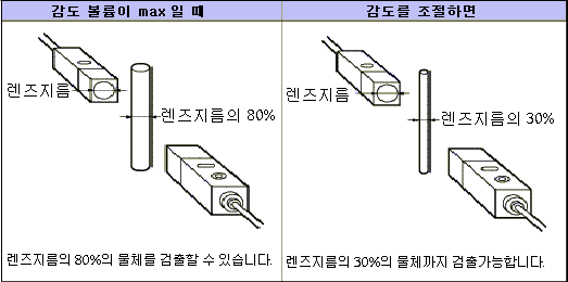 일반적인 기준으로서는 감도 볼륨을 변경시킴에 따라 렌즈 지름의 30~80%의 물체를 검출하는 것이 가능합니다.