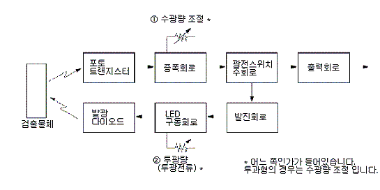 수광기의 수광량 또는 투광기의 투광량을 조정하여 검출거리를 설정합니다.