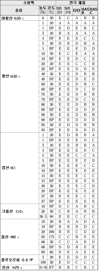 각 전극재질의 부식성에 대해서는 이하를 참조하시고, 전극 재질의 선정에 대해서는
