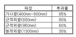 물에 대한 투과율은 파장에 따라 다릅니다.