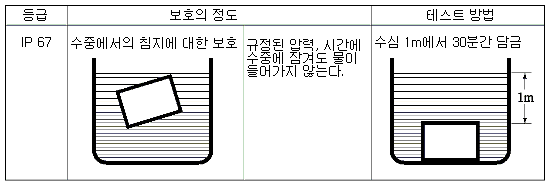 보호구조 IP67에 대해서는 IEC 규격(IEC60529)가 규정하는 그림의 보호 레벨을 만족하는 것 입니다.