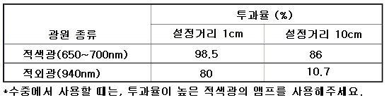(1) 수중에서는 빛이 감쇠해버립니다. 광원의 종류에 따른 수중에서의 투과율은 아래와 같습니다.