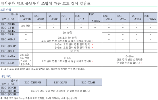 ※ 센서부와 앰프 유니트부의 조합에 따른 코드 길이 일람표를 첨부합니다.