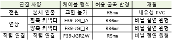 세이프티 라이트 커튼은 각 시리즈의 각종 케이블에 따라 허용 굽힘 반경이 다릅니다. 하기 표를 참고 부탁드립니다. 허용 굴곡 반경 이하로 구부러지면 케이블의 파손 또는 단선의 우려가 있습니다. 1) F3SJ-E 시리즈 2) F3SJ-B 시리즈 3) F3SJ-A 시리즈 4) F3SG-RA 시리즈 5) F3SG-RE 시리즈 6) F3SG-RA-01TS 시리즈 7) F3SG-RA-02TS 시리즈 8) F3SG-SR/PG 시리즈